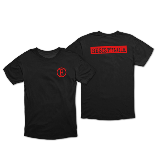 T-shirt preta, modelo unisexo, 100% algodão. Estampagem a vermelho no peito e costas.